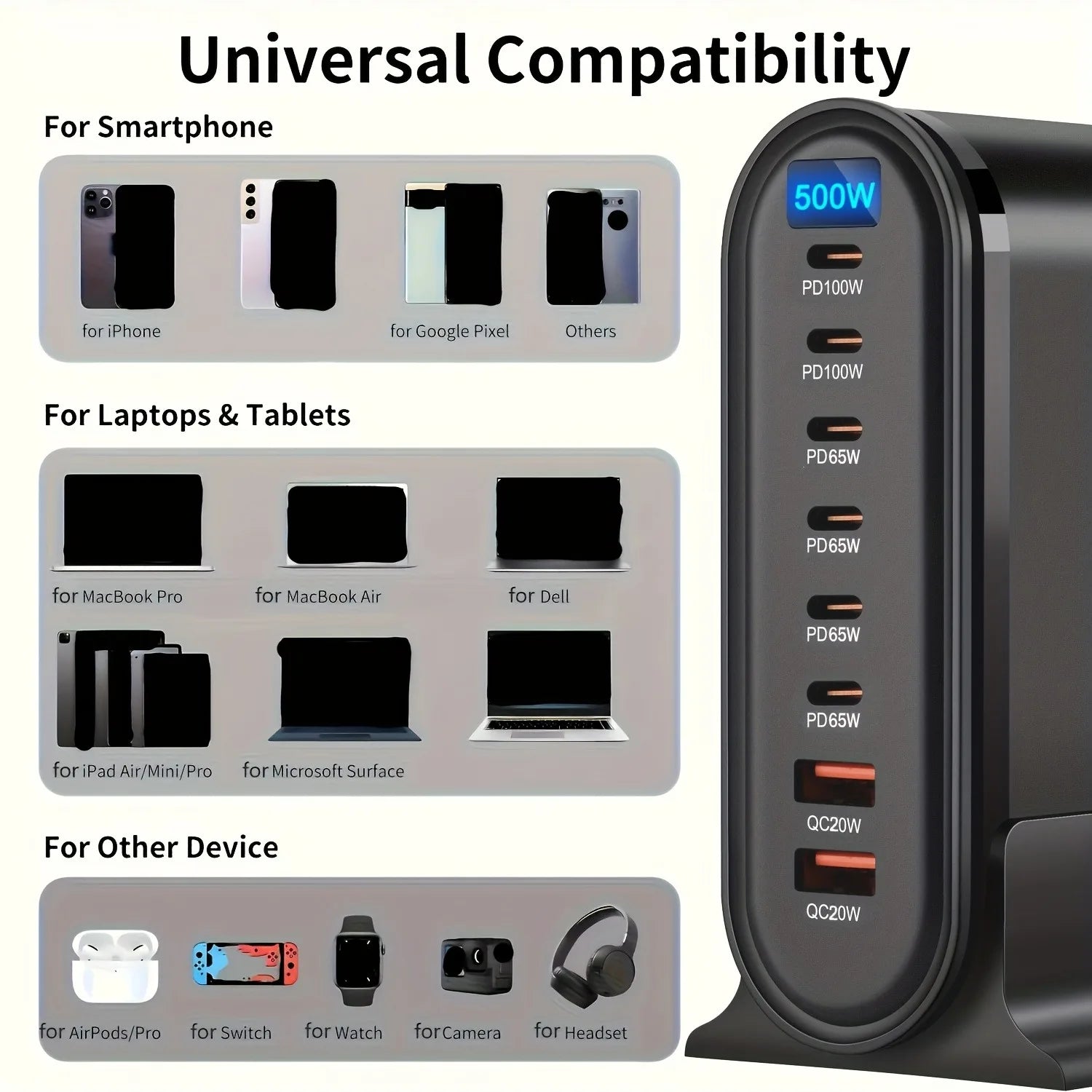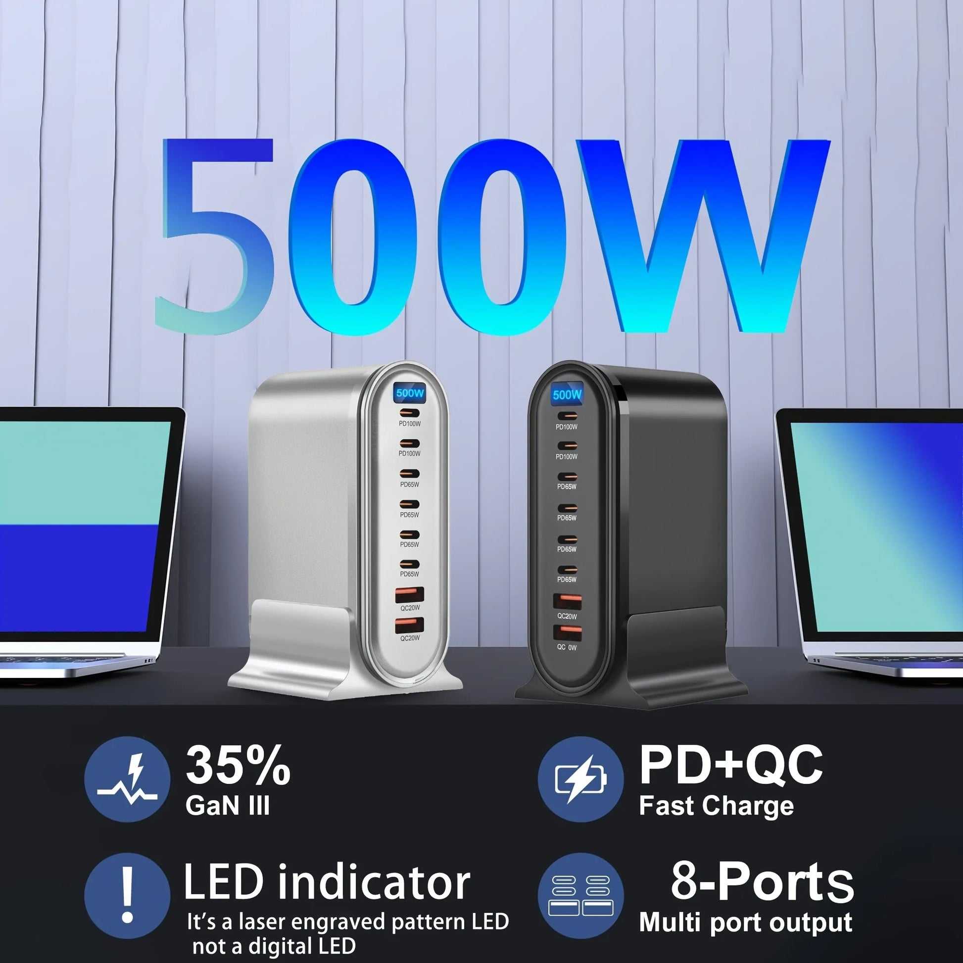 500W GaN Desktop Charger Station 8 Ports 2 USB-A and 6 Type-C PD 100W Fast Chargering Hub for Cellphones, for iphone, for MacBook etc. LED Indicator