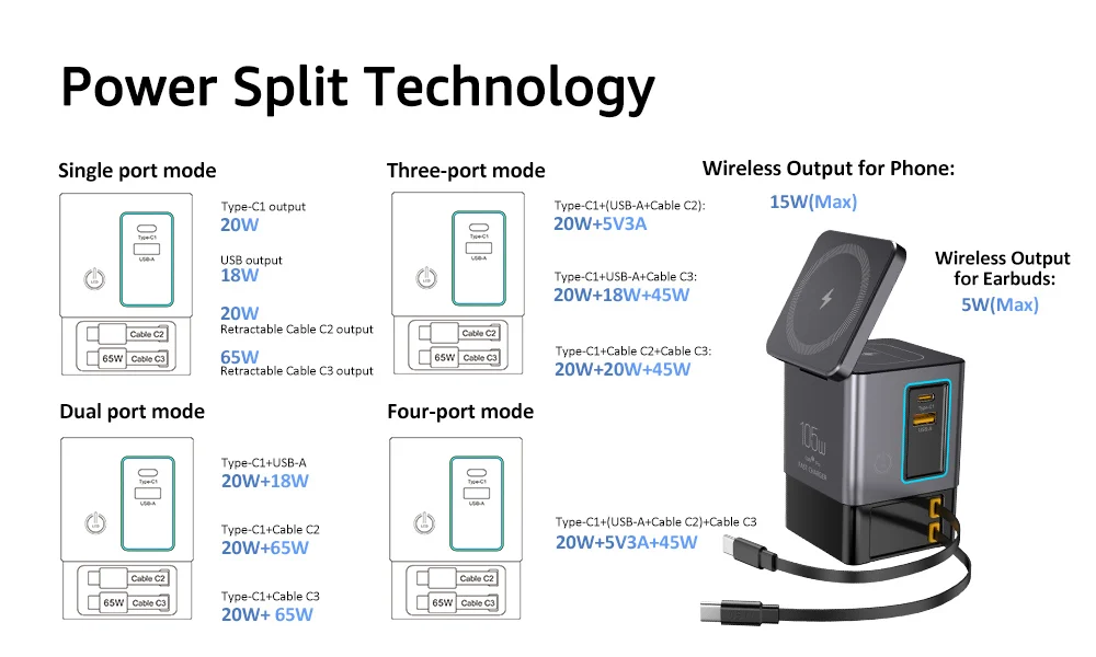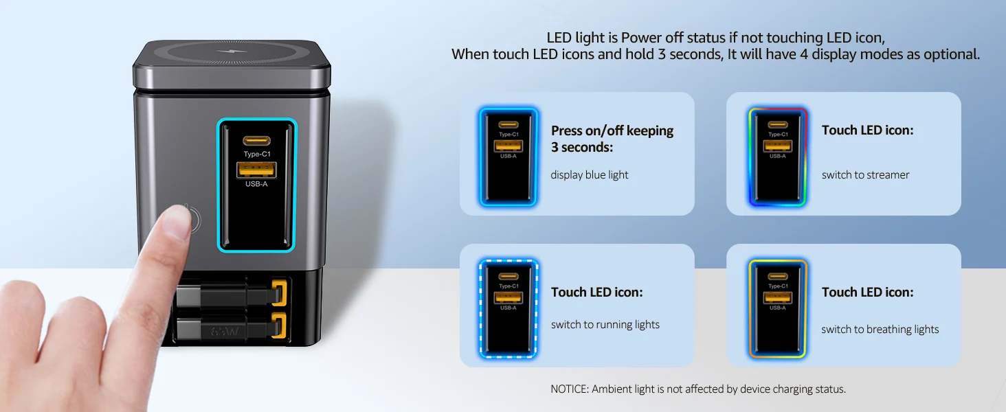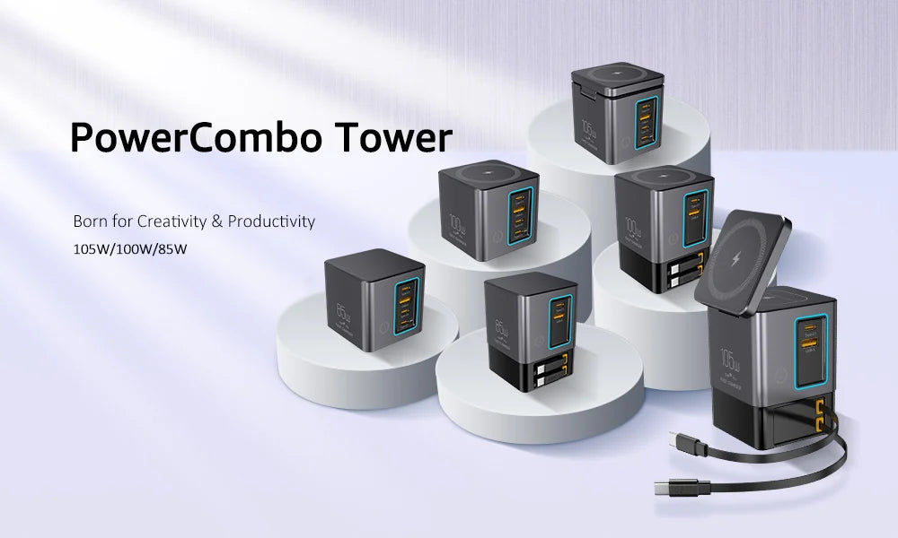 6-in-1 105W Charging Station with Retractable USB-C Cable Power Combo Tower for Multiple Devices Fast Charger for iPhone, Airpod