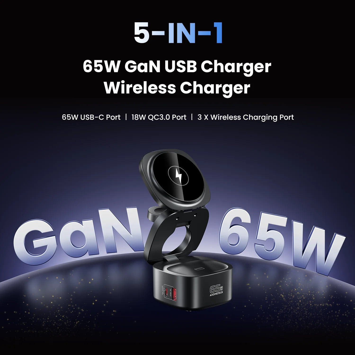 65W GaN USB Type C Wireless Charger Station 5 In 1 USB C PD3 0 QC3 0 For Mackook iPad iPhone 16 AirPods iWatch Wireless Charger