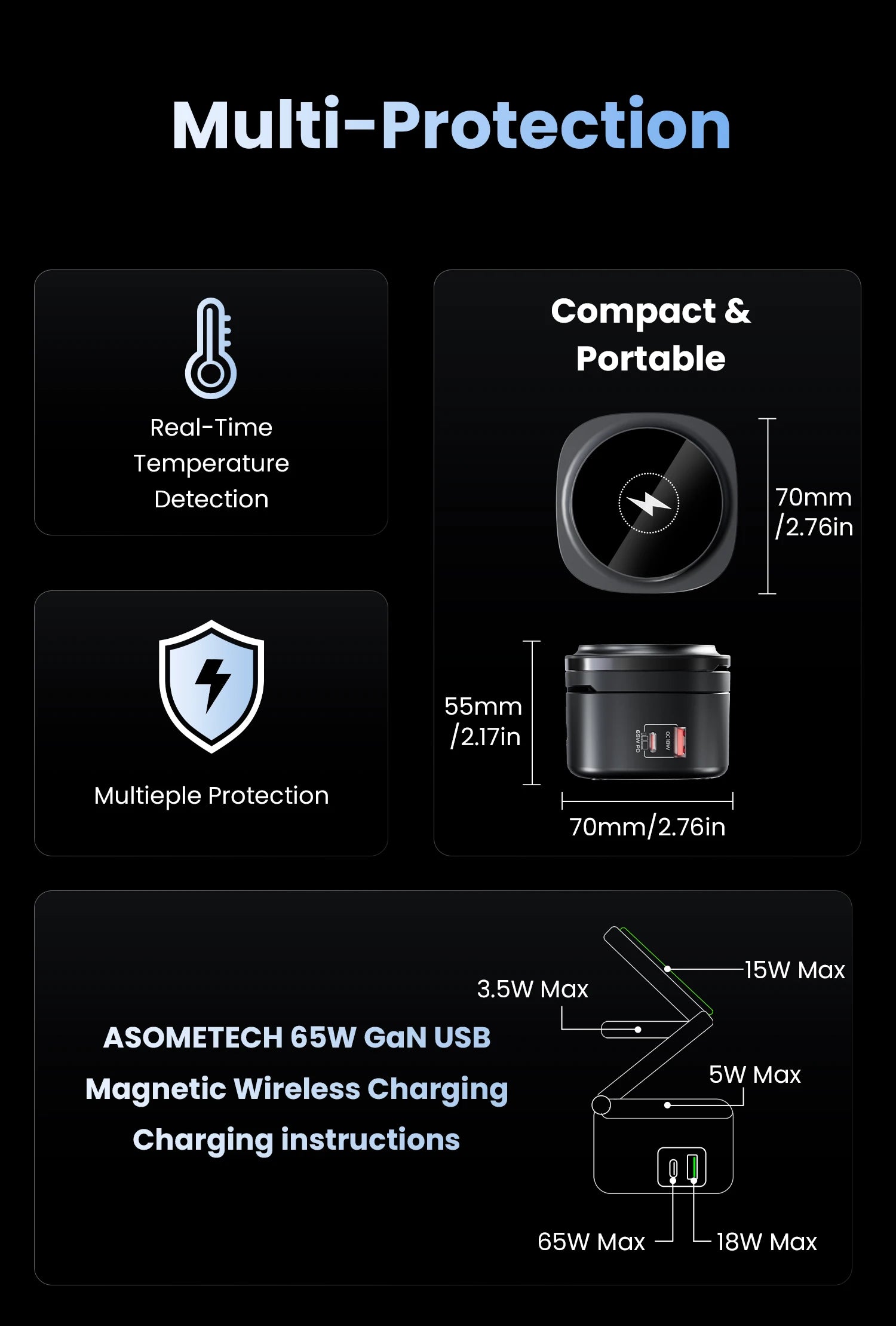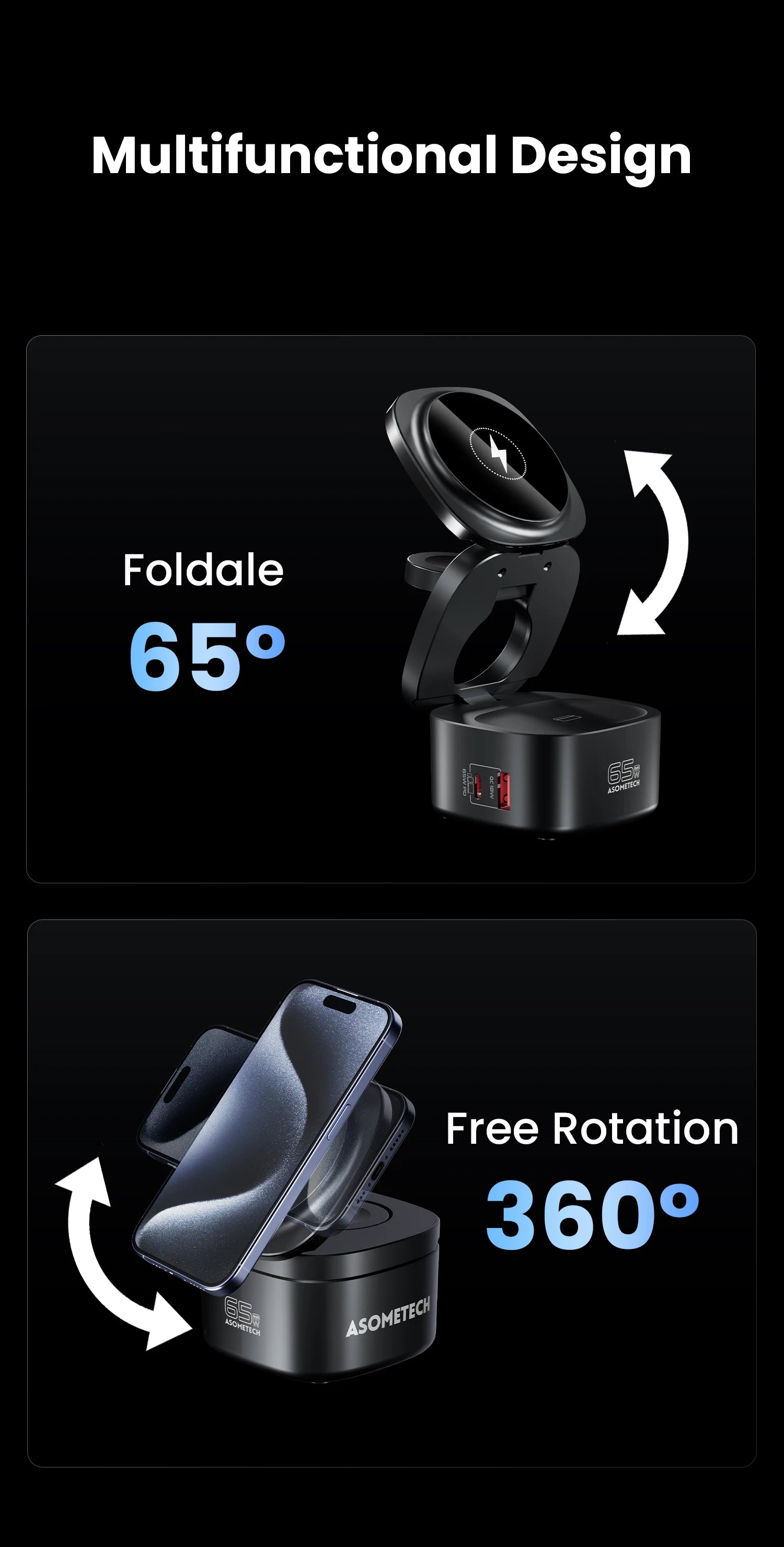 【Foldable15W Magsage Wireless Charging Stand】: This Magnetic charging staion supports 15W ultra-fast wireless charging , ensuring safe, fast and efficient charging at all times
