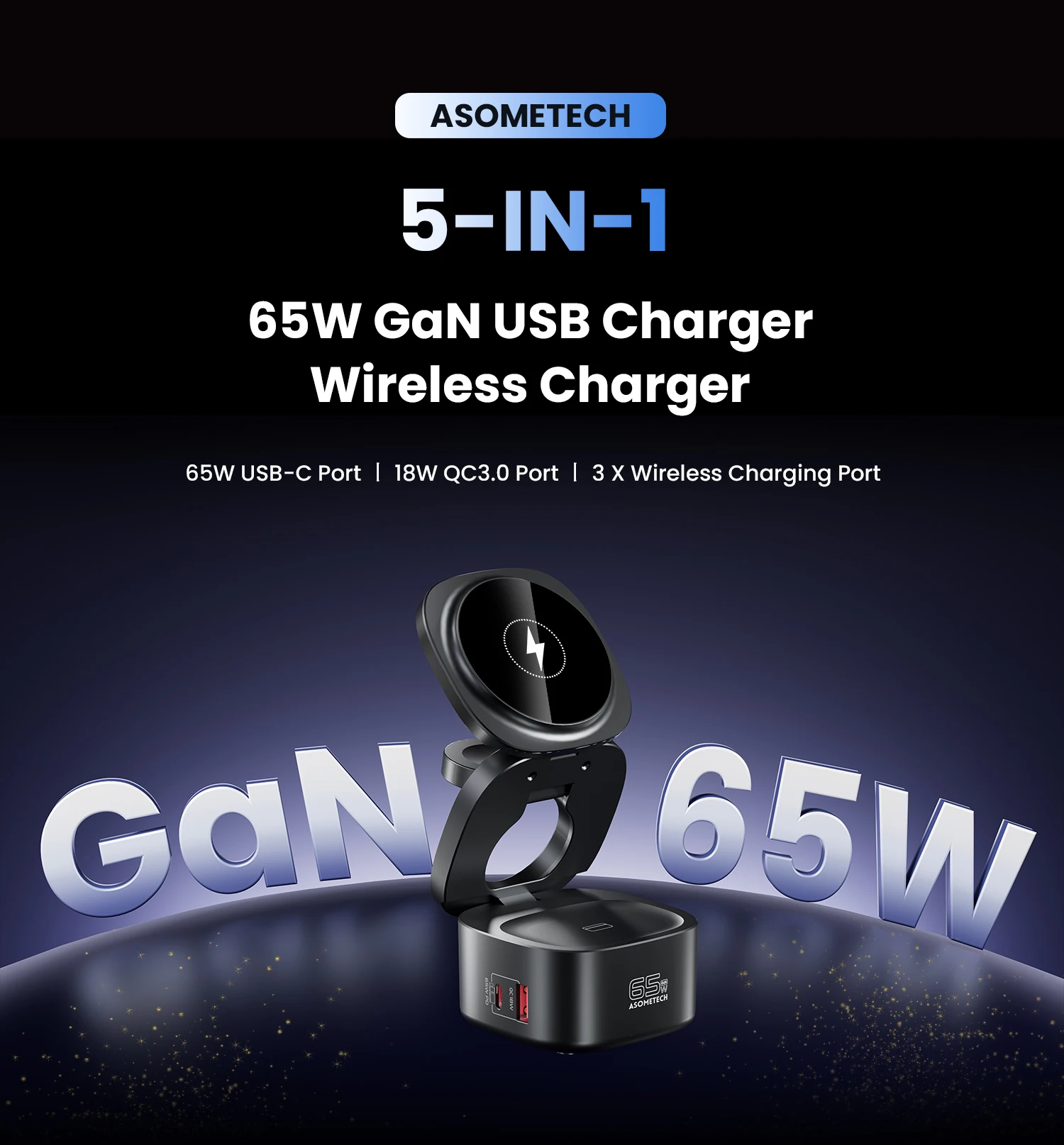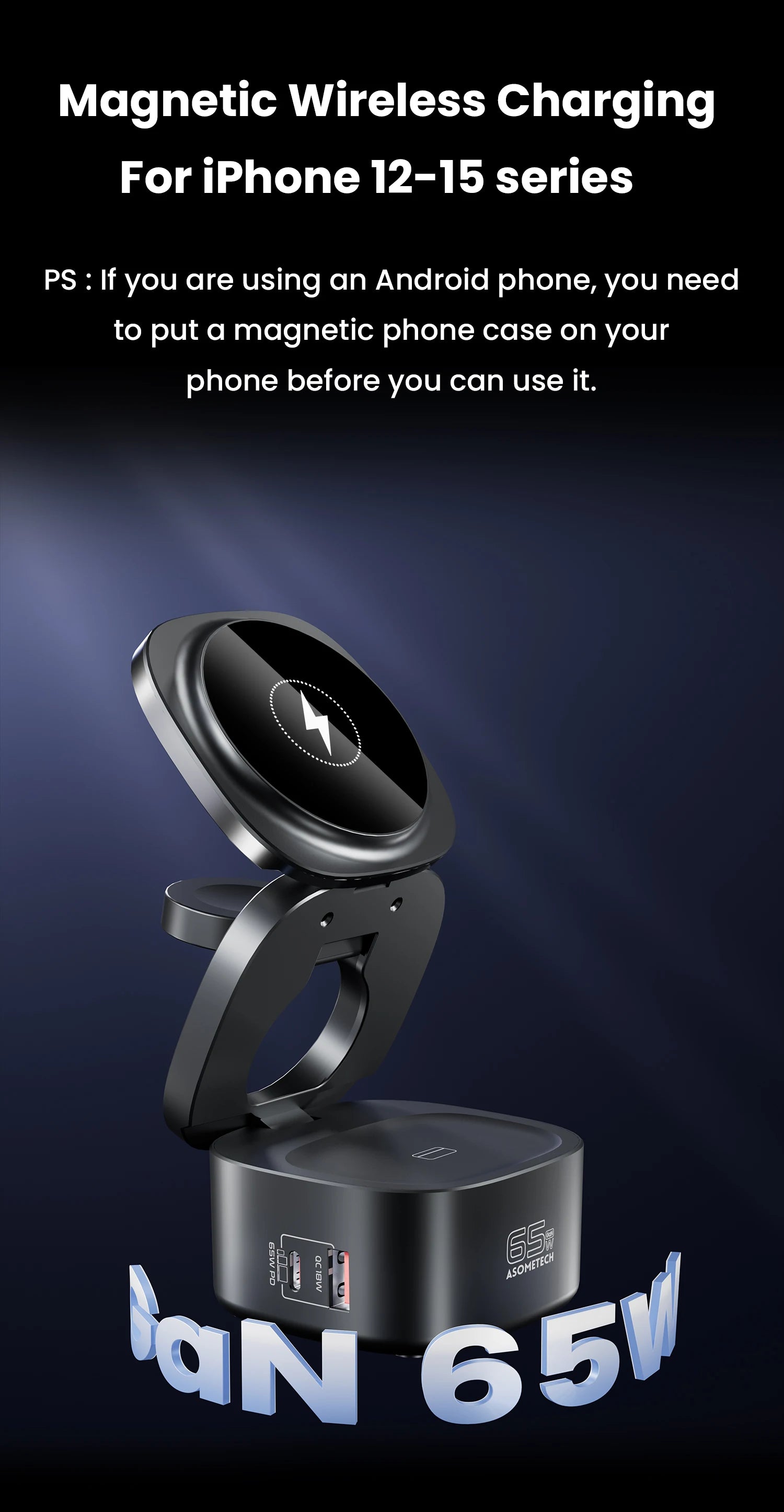 【5 in 1 Wireless Charging Station for Multiple Devices】: 65W GaN Charging Station is in USB-C + USB-A + 15W Magnetic Wireless Charger + Wireless Charger For Airpods + Watch Charger For Apple , with an excellent power supply and charger for Apple Watch, laptops, tablets, cellphones, and other electrical appliances. wireless charger stand allows you to charge up to 5 devices at the same time.