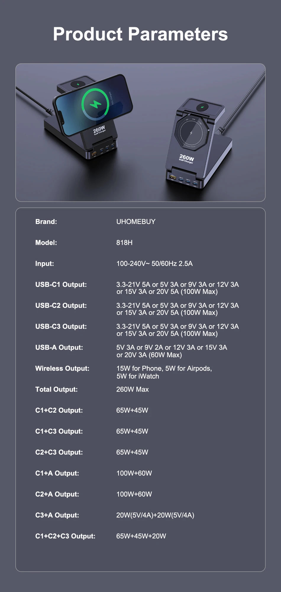 UHOMEBUY 260W charger is equipped with 3 USB-C ports, 1 USB-A port and 3 wireless charging options, of which the USB-C1/C2/C3 ports support a maximum of 100W output, the USB-A port supports a maximum of 60W output, and the wireless charging options supports 15W for mobile phones, 5W for Airpods and 5W for iWatch, so it can satisfy the fast charging needs of your multiple devices.