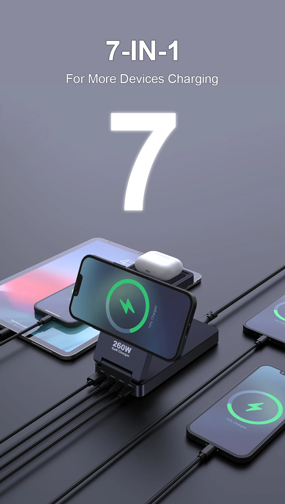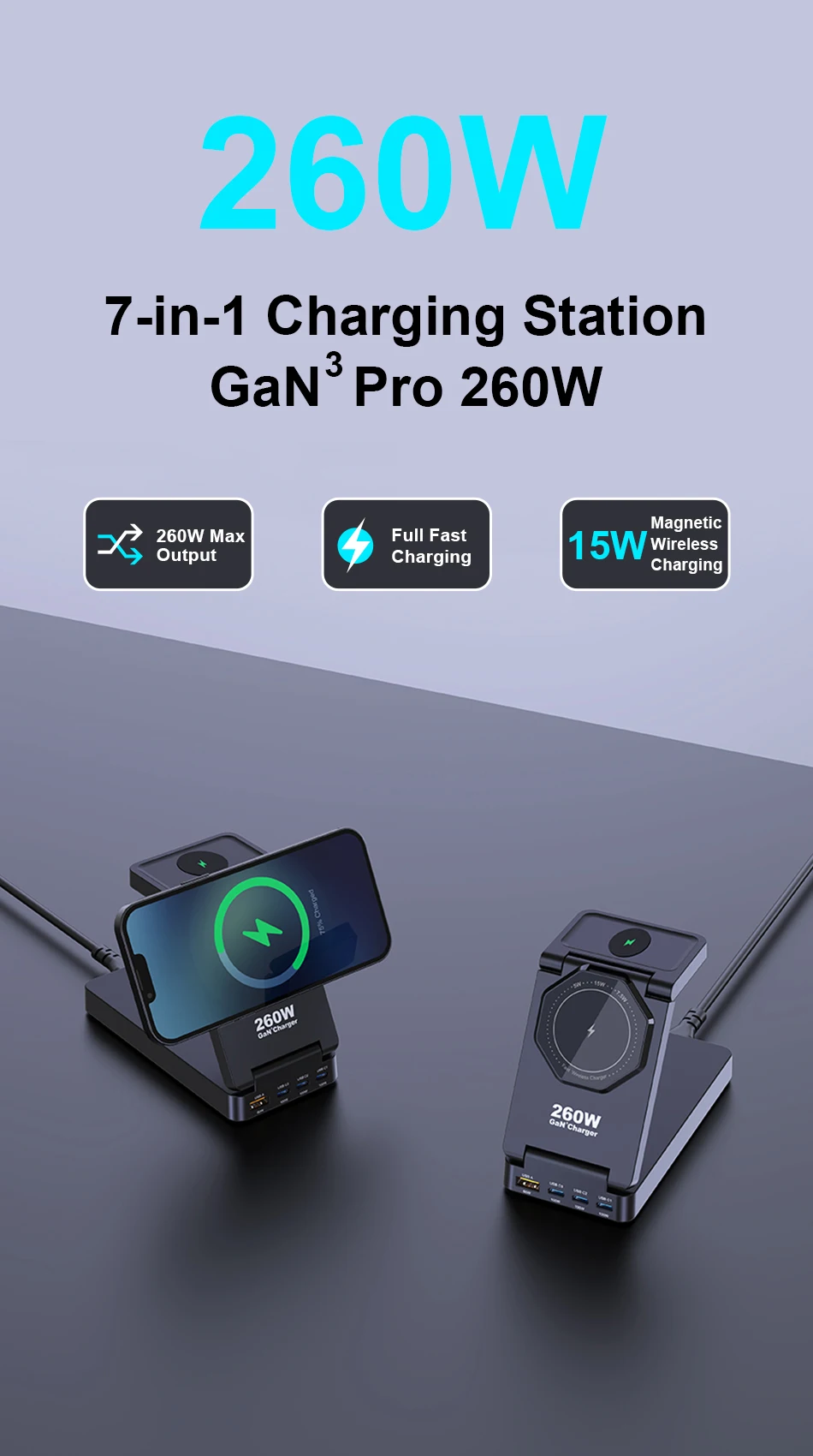 7-in-1 Charging Station 260W GaN Fast USB C Desktop Charger 15W Magnetic Wireless Charger for iPhone 16/15 Pro Max MacBook Pro