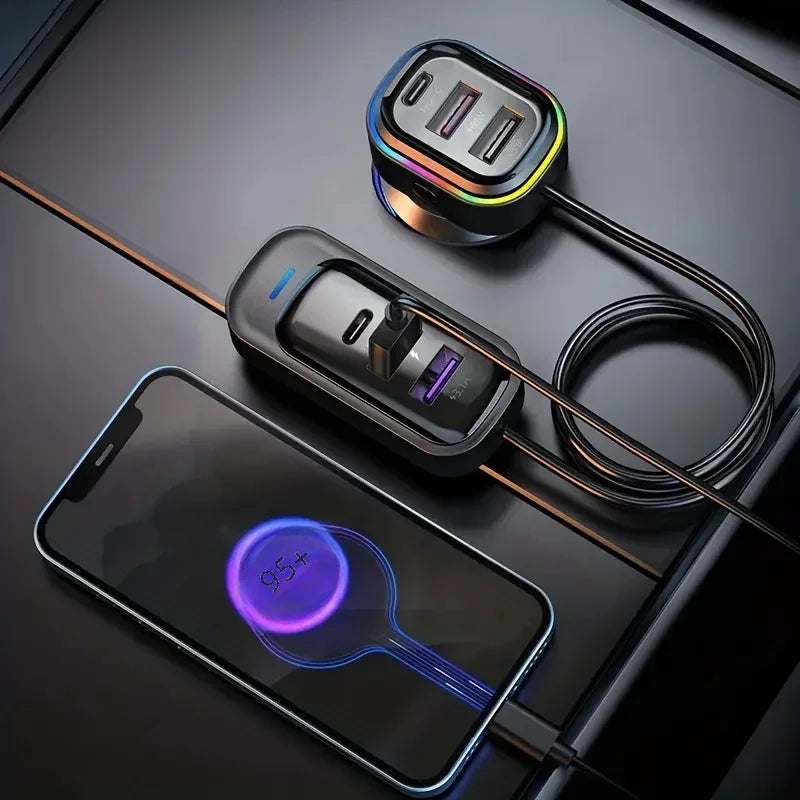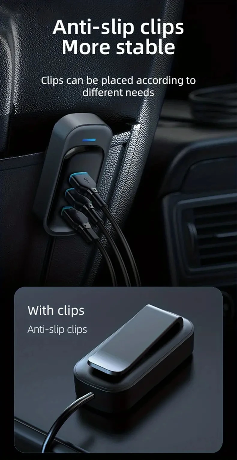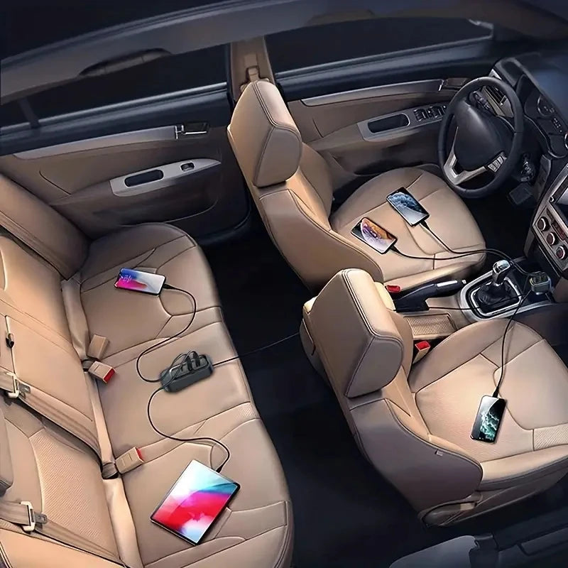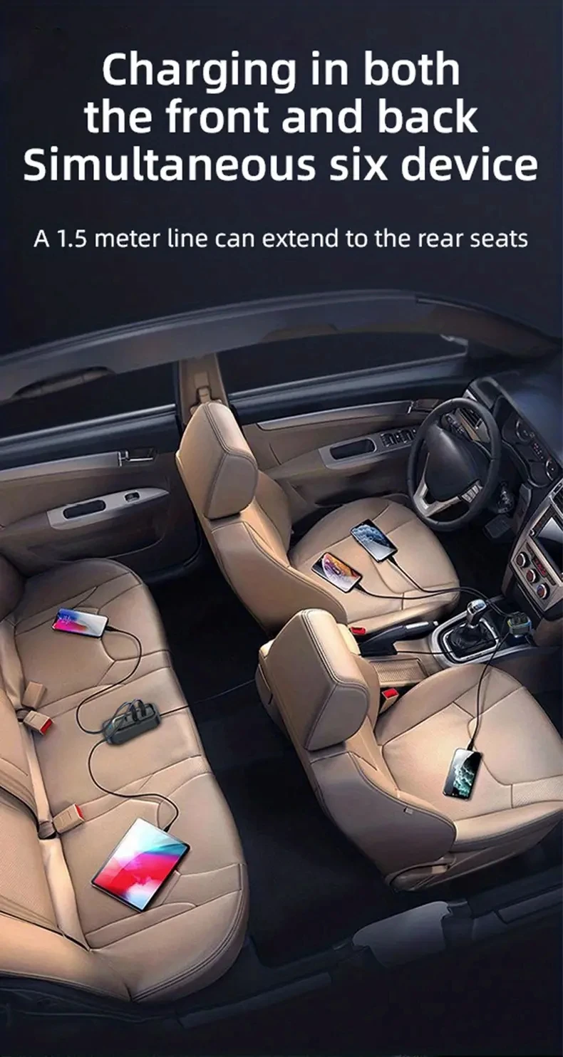 81W Fast Car Charger 6-Port Expansion Simultaneous Front and Rear Charging Type-C 2-USB 1.5m Extension Cable Anti-Slip Clamp