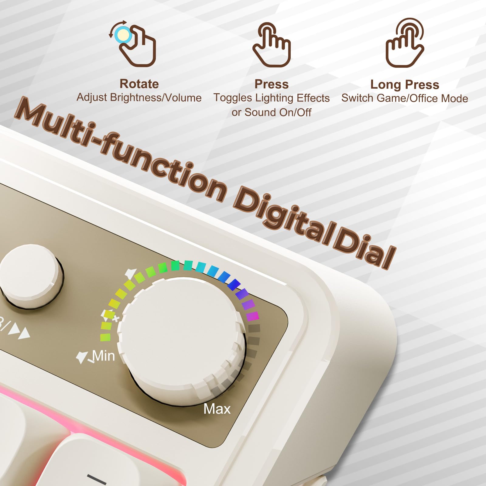 Illuminate your gaming environment with the dynamic RGB backlighting. Customize the lighting patterns to match your mood or game theme. The intuitive media knob allows you to adjust volume and other media settings effortlessly, giving you more control without interrupting your gameplay.