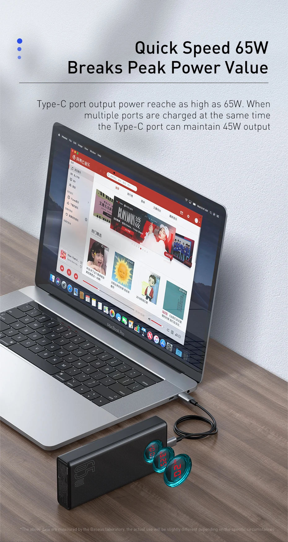 Baseus Power Bank 30000mAh 65W PD3.0 Quick Charging 3.0 FCP SCP Portable External for iPhone 16 15 14 Laptop Tablet Power bank