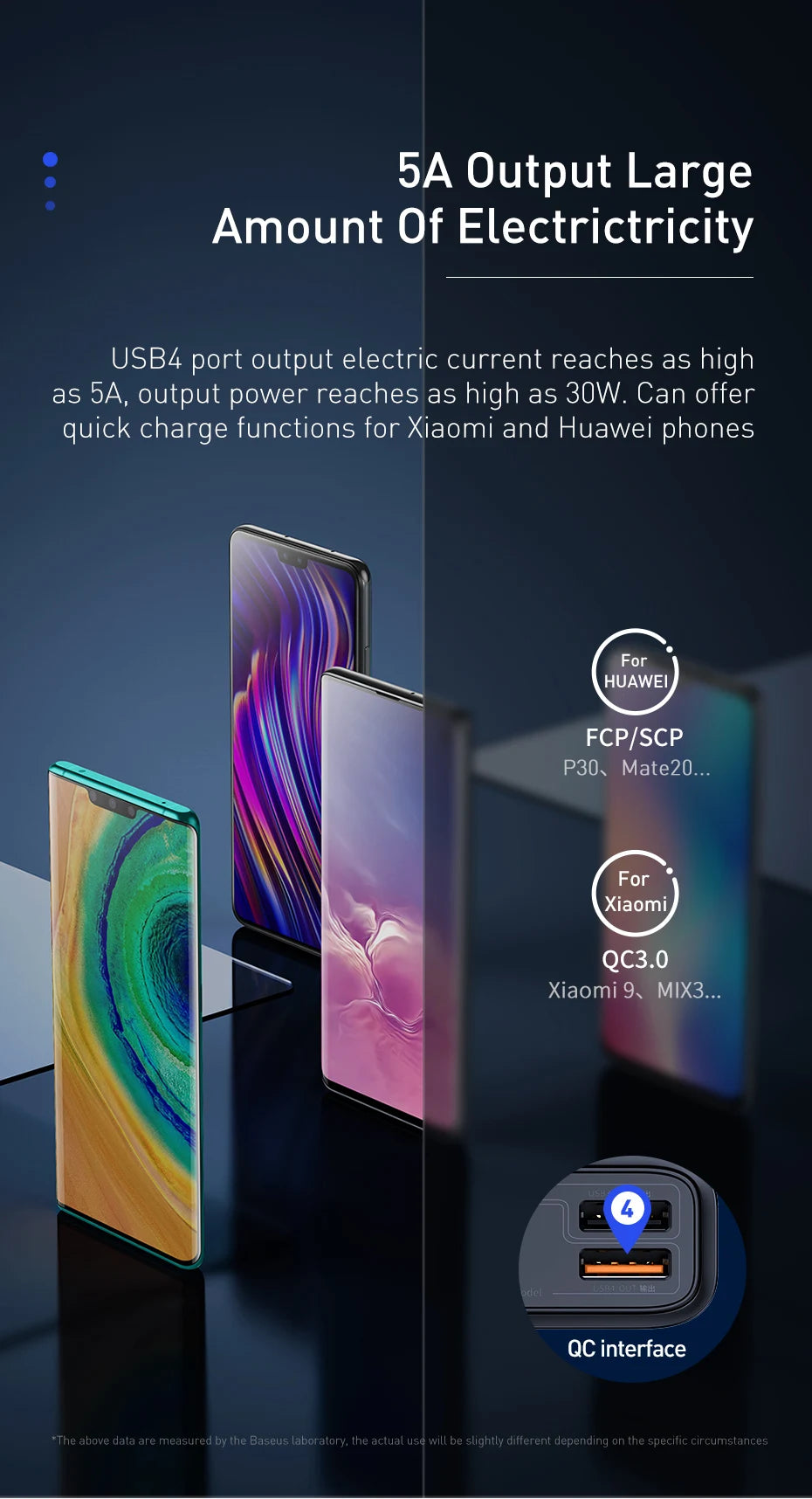 USB 4 Output: About 5V/4.5A,4.5V/5A,5V/3A,9V/3A,12V/2.5A,20V/1.5A 30W(SCP QC3.0)