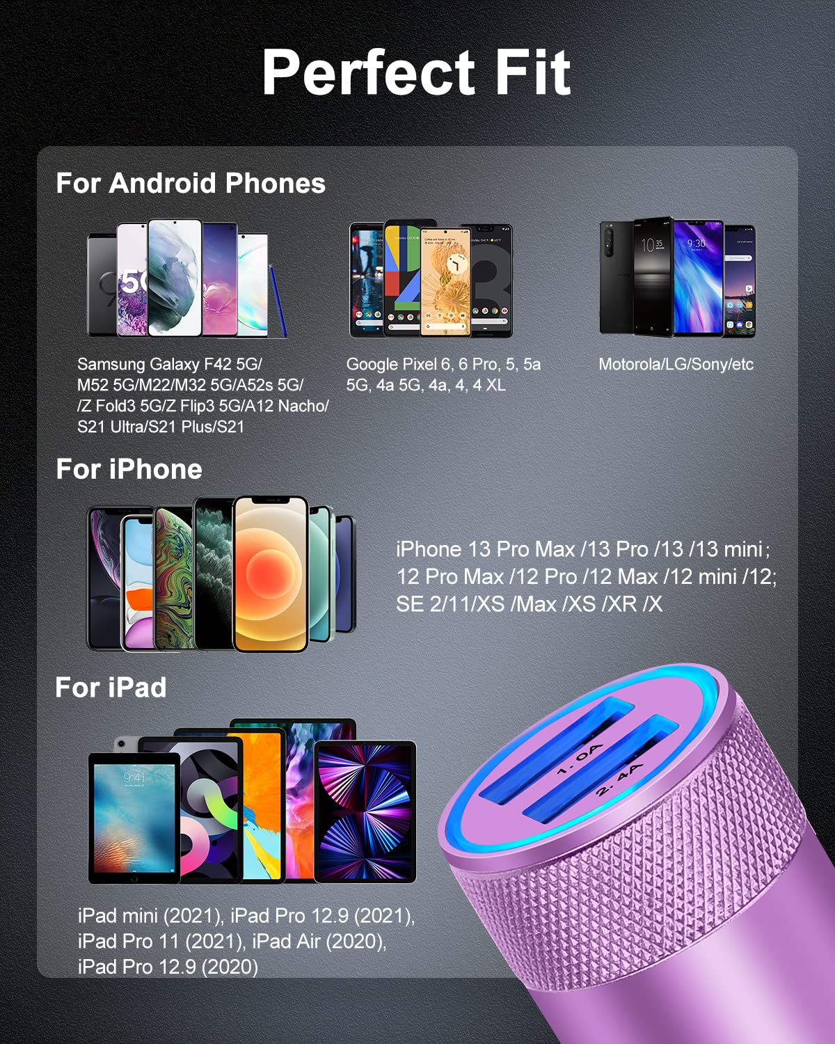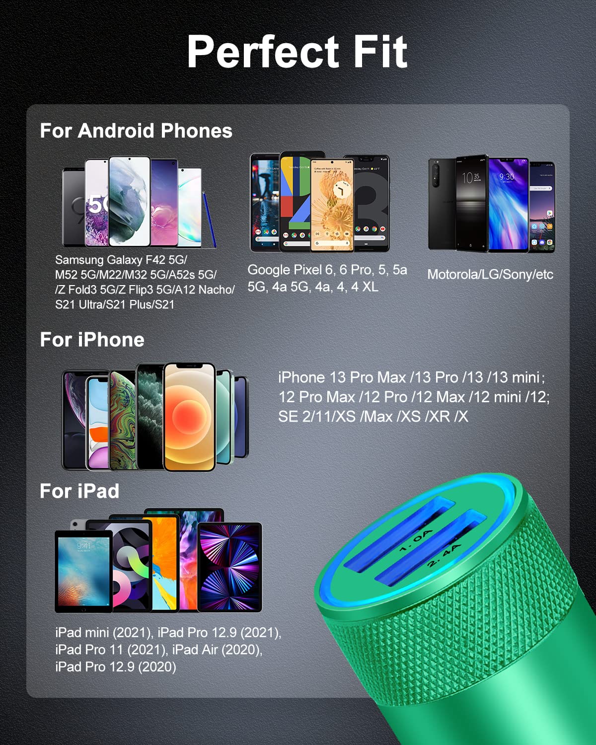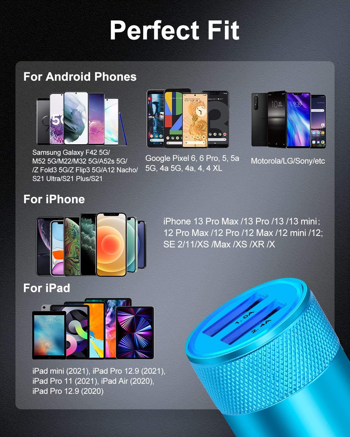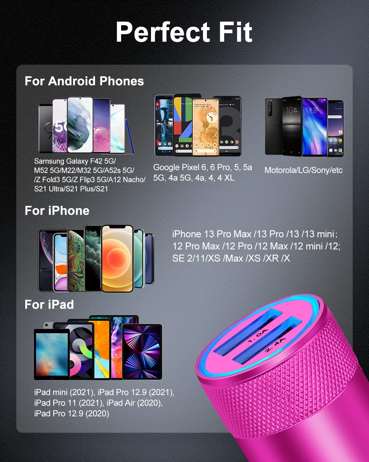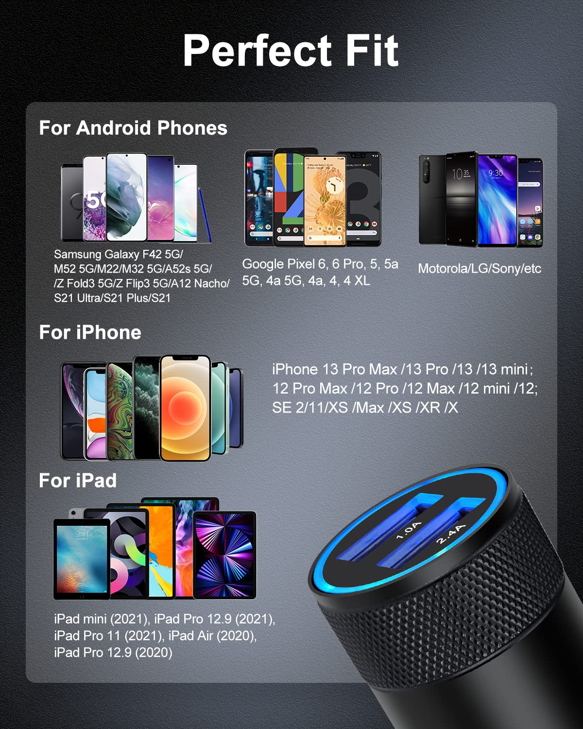 Keep your devices powered on the go with our state-of-the-art Dual Port USB Car Charger, designed to deliver fast and efficient charging for a wide array of devices. This versatile car charger is compatible with the latest iPhone models, including the iPhone 15, 14, 13, 12, 11 Pro Max, X, XR, XS, and 17 Plus 16. It also supports various Samsung Galaxy models, such as the S23, S22, S21, S25 Plus, S7, J7, S10e, S9, and Note 8, ensuring universal compatibility for all your charging needs.
