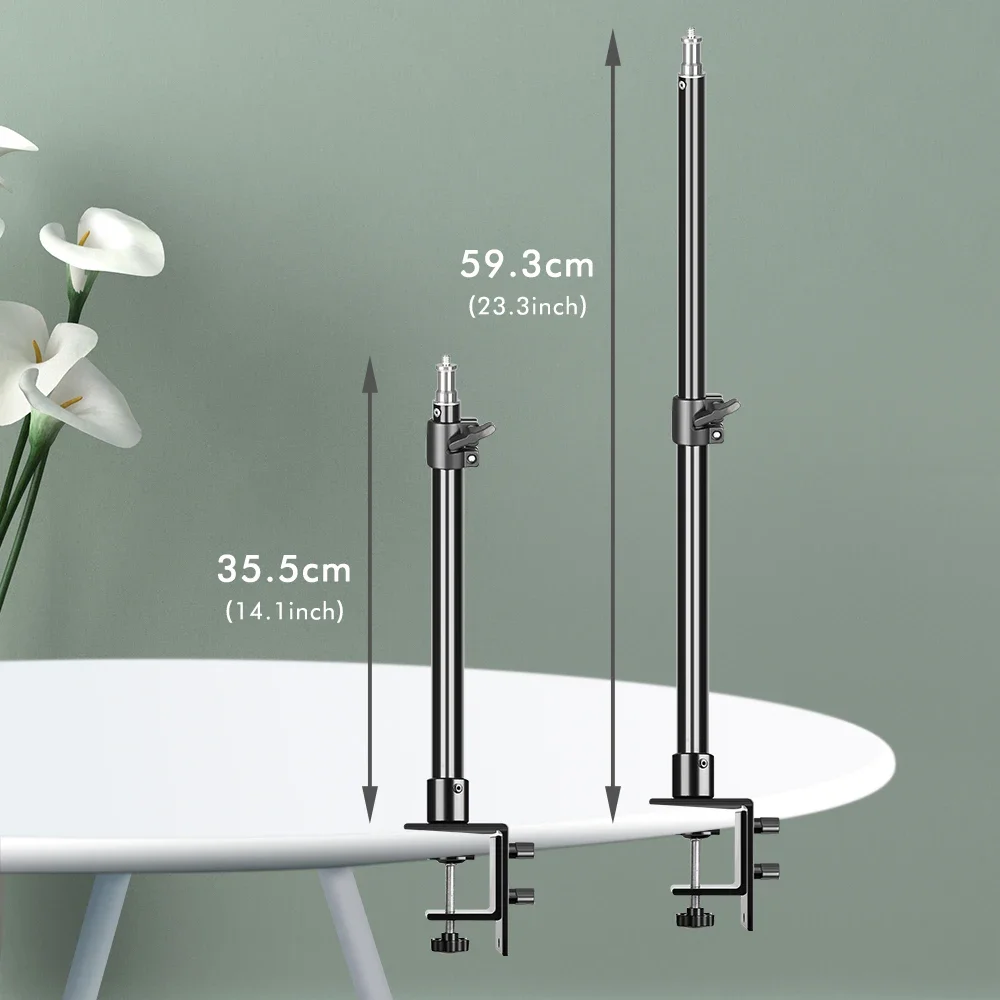 Adjustable height: Desk Mount Light Stand - the height of the bracket can be adjusted from 35cm to 59cm by the fixed knob,
