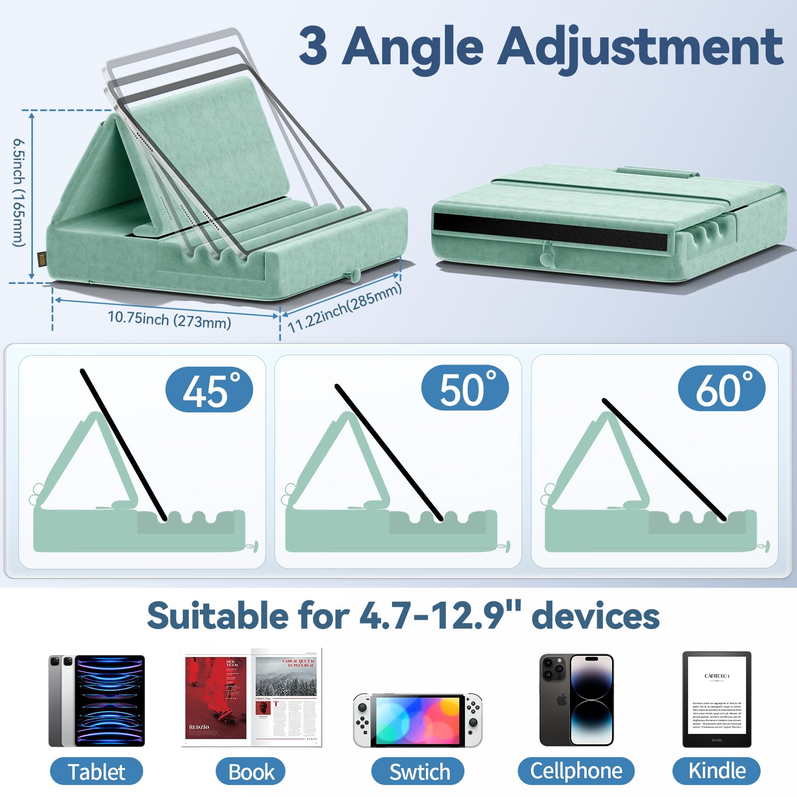 The KDD Tablet Pillow Holder is compatible with a wide range of devices, including the iPad Pro 12.9, 10.5, and 9.7, as well as the iPad Air and Mini (generations 3 to 6), Galaxy Tab, and various e-readers. Its thoughtful design features a convenient pocket for storing accessories and a stylus mount to keep your tools close at hand.