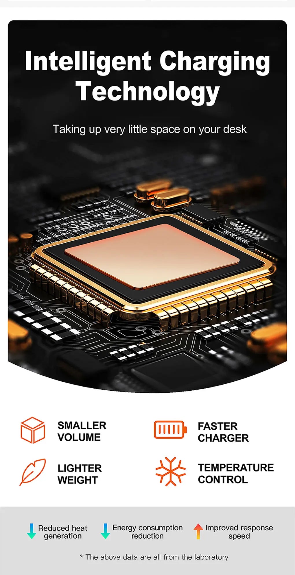 - **Intelligent temperature control technology**: high temperature automatically adjusts the power, prolonging the life of the charger and device battery.