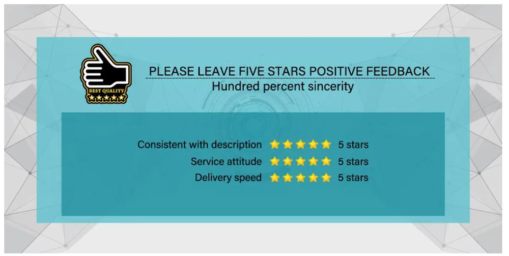 Your positive comments is the driving force for our continuous improvement. We respect and trust every customer to provide you with qualified products and services. If you are satisfied with our products, please give us a five-star positive feedback. If you have any questions/problems after receiving the product, please contact us by Ali message as soon as possible and we will try to solve it for you positively at once until you are satisfied. While leaving a negative feedback will not solve any problems!