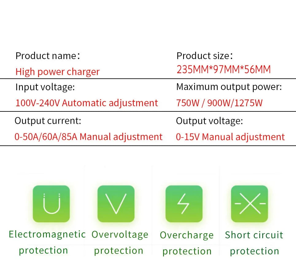 Special instructions for 60A/85A/100A charger: first plug the charger into the power supply - look at the voltage - turn the current on key higher - then adjust the voltage - then connect the load (+To+, - To -) - finally adjust the current. Do not connect the battery before adjusting the voltage, otherwise it will burn out the charger motherboard. Adjust the current again. Do not connect the battery before adjusting the voltage, otherwise it will burn out the charger motherboard. The screen displays the actual current value, which is not the current value you adjusted. Please consider the battery capacity and the maximum BMS current value for the current size. When the battery is fully charged, the current will be very small, with a full charge current of 0