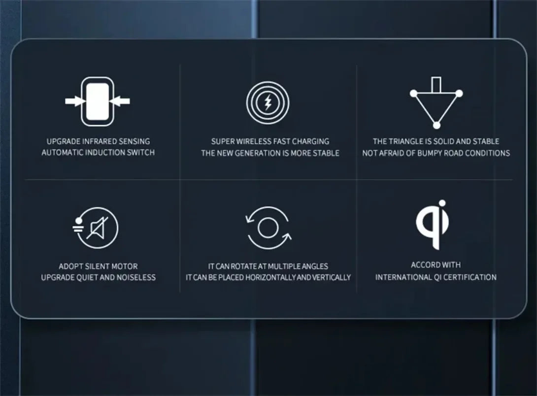 [360-degree rotating] Cradle provides flexible choice of watching your phone or GPS while driving. That means there will be no blocked vision and you can get a perfect viewing angle with the car wireless charger mount.